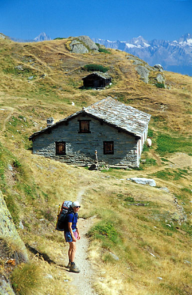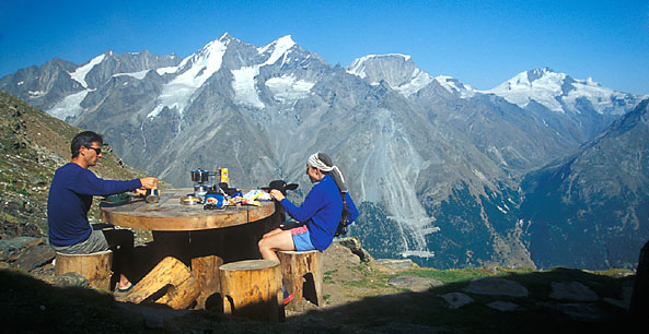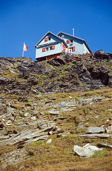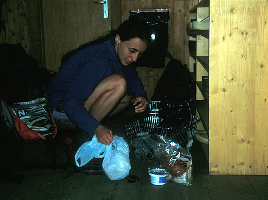 Po cestě ještě pro jistotu voláme na chatu a hlásíme náš příchod. Před chatou trávíme překrásný zbytek dne. Výhledy jsou nádherné a slunce zde svítí až do pozdních hodin. Chata je plně obsazená. Před chatou je pramen, ale s cedulí, že je voda nepitná protože je brána z ledovce, a chodí k ní pít i drzé kozy, které nám ukradly kus chleba. My jsme vodu pro vaření používali.