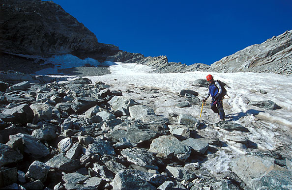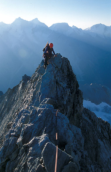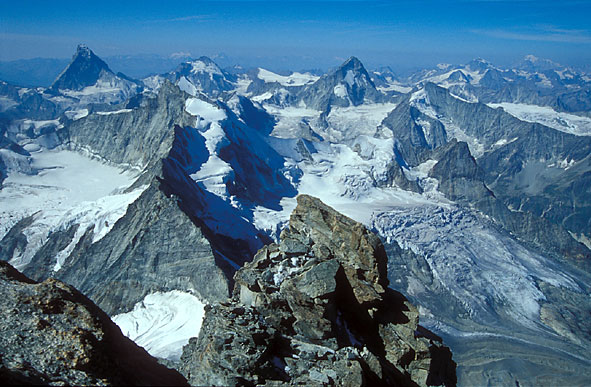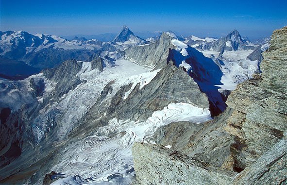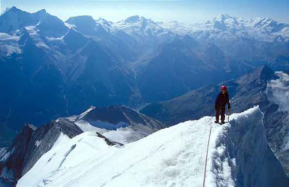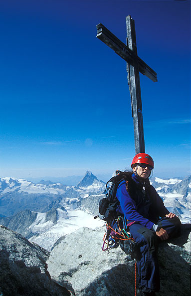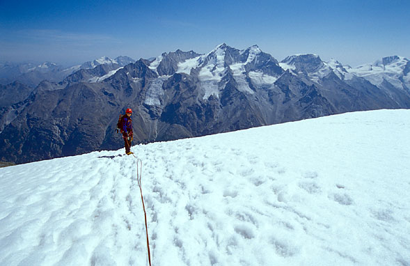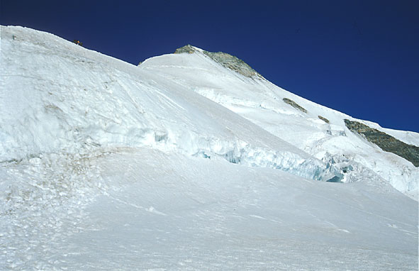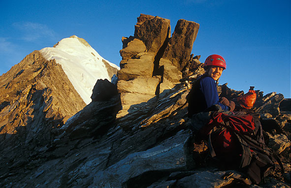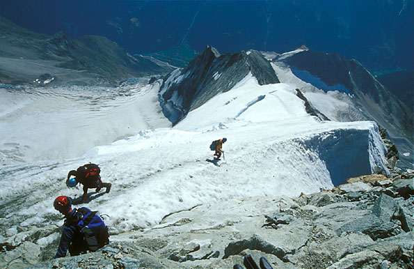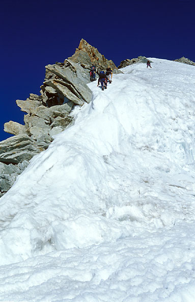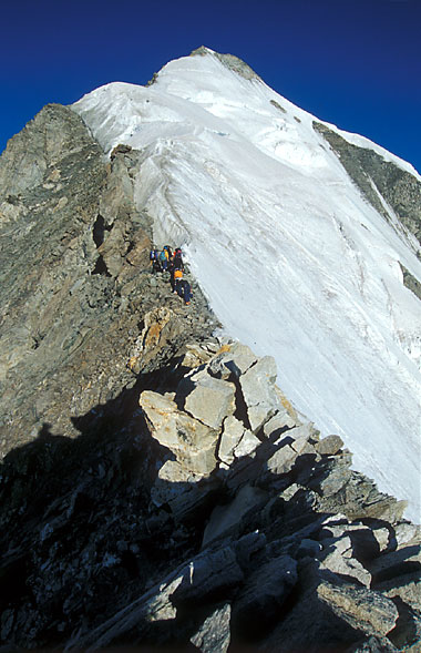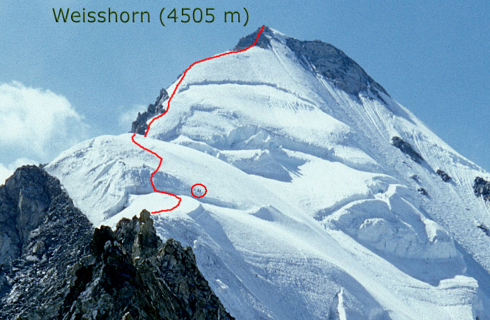 Chvíli po rozednění (po 3,5 hodinách) jsme na místě zvaném Fruhstucksplatz (3916 m). Zde dáváme svačinu. Vidíme že první horolezci jsou již na sněhovém poli. Skalní hřeben je lehké lezení většinou v pevné skále. Což moc neplatí o výstupu na tento východní hřeben. Po hřebeni postupujeme společně na krátkém laně. Jistit se dá vcelku dobře. Kolem 8 hodiny se dostáváme k sněhovému hřebenu. Odhadujeme ještě 2 hodiny na vrchol. První horolezci jsou již pod skalnatým vrcholem. Lezení v ledovém svahu není moc ideální. Pod slabou vrstvou nekvalitního sněhu je tvrdý vodní led. Cestou se překonává několik sněhových mostů přes trhliny a odtrhy. O půl jedenácté (cca po 9 hodinách) stojíme konečně na vrcholu Weisshorn (4505 m). Díky nádhernému počasí máme okolní kopce jako na dlani. St