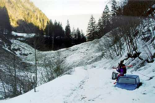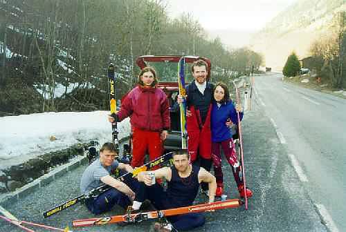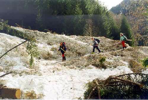 Naše skupina se rozděluje, kluci odcházejí směr Dachstain s lyžemi na zádech a my začínáme stoupat obrovským laviništěm vzhůru do kotle napravo od jezera. Půlky se mi svírají strachy při pohledu na ničivou silu laviny, která se tudy prohnala. Asi kilometr nad námi jde vidět další skilapinistický pár, který nám brzo zmizel z dohledu v lese. My si za cíl dáváme opačnou stranu hřebene, kde je i konečná stanice lanovky. Po 1a 1/2 hodinovém stoupání svahy zbrázděnými lavinami se dostáváme do centra lyžařského střediska. Jako odměna za dlouhý pochod vzhůru nás čeká lyžování zdarma ( ski pasy se ukazují pouze v kabinové lanovce)! Brzy jsme nasyceni upravenýma sjezdovkami a jedeme zpět dolů do údolí, kde nás čekají kluci a pivo. Žleby jsou zmrzlé a ledovaté, ale požitek z jízdy mezi skalami skvělý.