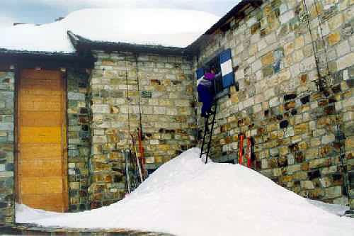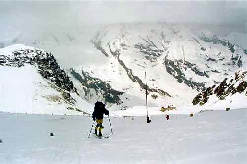 25.3.-28.3.1999 Před tím uragánem cestou pod Glockner jsme se schovali v chatě kde bylo muzeum! Ona to nebyla jen bivakovací chata, ale vlastně obr hrad s kinem, muzeem a laboratoří. Celé to funguje jen v Létě pro turisty a v Zimě je to pusté a navštíví to v nouzi jen Alpinisti. Díky správci chaty který ji nechal přístupnou, jsme se ušetřili dalšího pochodu přes sněžnou pláň (kde vítr odhazoval sněhové kry do vzduchu) k tunelům v kterých jsme snad mohli přenocovat. To jsme ještě netušili, že jsou uzavřené a další den je budeme muset obcházet. Nakonec díky mlze a nepohodě jsme nikdy nedošli k Ledovci pod Glockner a dvě noci jsme trčeli v boudě a čekali na Slunce. Nakonec sice vyšlo, ale pořád ten neutichající uragán. Řekla bych, že vítr byl silnější než já a batoh, taky jsem byla pořád na zemi.