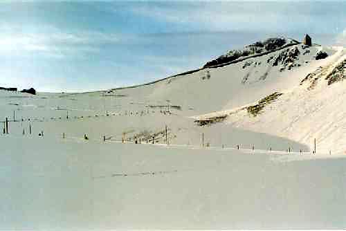 Než jsme se vydali na zpáteční cestu do údolí chtěli jsme se s okolními svahy rozloučit alespoň nějakým hodnotným sjezdem. Vybrali jsme si kopec na jehož vrcholu byla vyhlídka s chatkou. Hřebenem jsme stoupali nahoru, ze začátku se mi líbilo, že mne vítr tlačí do zad a chůze do kopce byla spíše příjemná. S přibližujícím se vrcholem sílil vítr a mé obavy, že mne to přefoukne přes hranu do stráně. Lyžovačka dolů nepřicházela v úvahu, byli jsme rádi, že jsme se přikrčení vrátili celí, zase zpátky pod kopec.