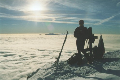 Kolem půl třetí děláme vrcholové foto a připravujeme se ke sjezdu. Hladina adrenalinu u mne mírně stoupá.