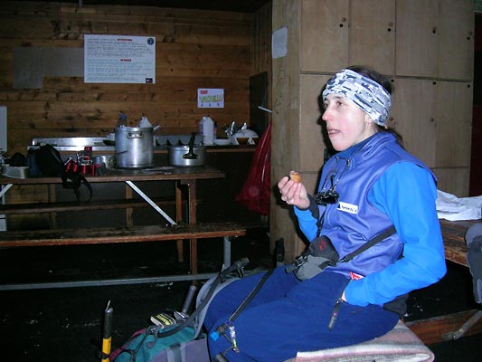 Cestu prošlapáváme, před námi tu šel pouze někdo se sněžnicemi. Na chatě je otevřené zimní místnost, kde dáváme sváču a poté sjíždíme zpět do Argentiére.
