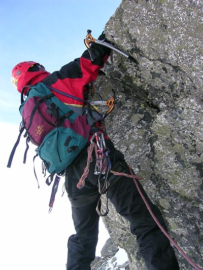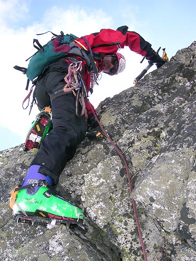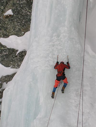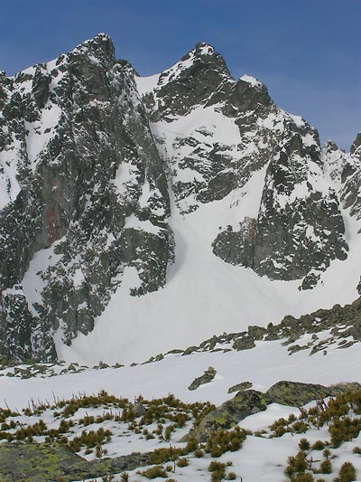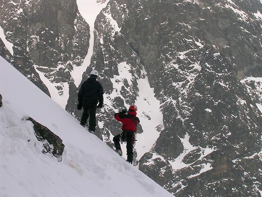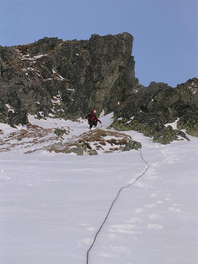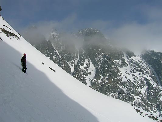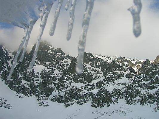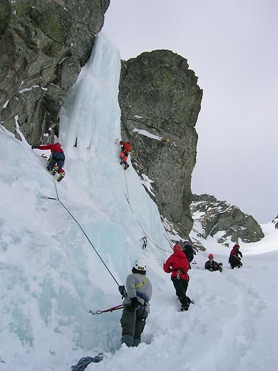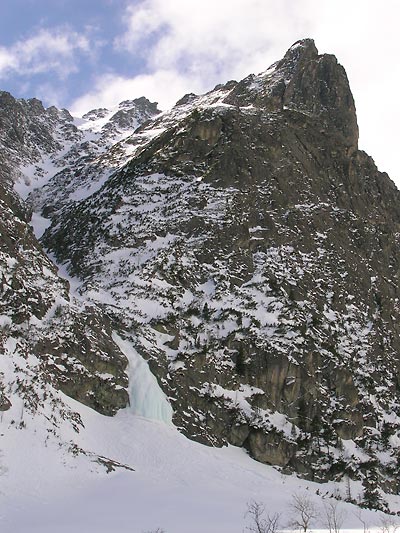 Úterý, dnes už se snad konečně i něco vyleze. Asi 4 dvojice lezou na Kvetnicovou vežu. My s Filipem jdeme na led Sopeĺ, který je dobře vidět od chaty.