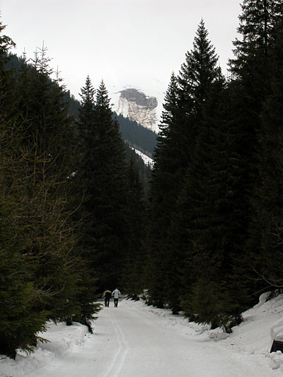 Počasí je špatné, dole prší, nahoře postěžuje. Sněhu je ale dost, tak se dá jít na pásech hned z parkoviště.
