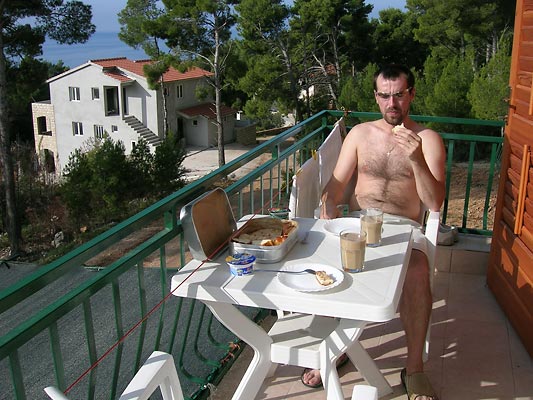 Ubytování si sháníme na Internetu předem. Sezóna je již pryč a tak jsou ceny přibližně poloviční. Chtěli jsme původně bydlet přímo ve Sveta Nedjelja, kde nám nabízel nějaké zprostředkované ubytování Miro, nakonec ale Klárka shání příznivější v nedalekém (cca 5km) Ivan Dolaci. K moři cca 100m, k prodeji vína o chlup dále. Nic jiného tu mimo turistickou sezónu stejně není.