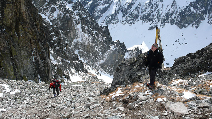 Ze sedla širokým žlebem do kotliny Piatich Spišských ples a odtud k Téryho chatě.