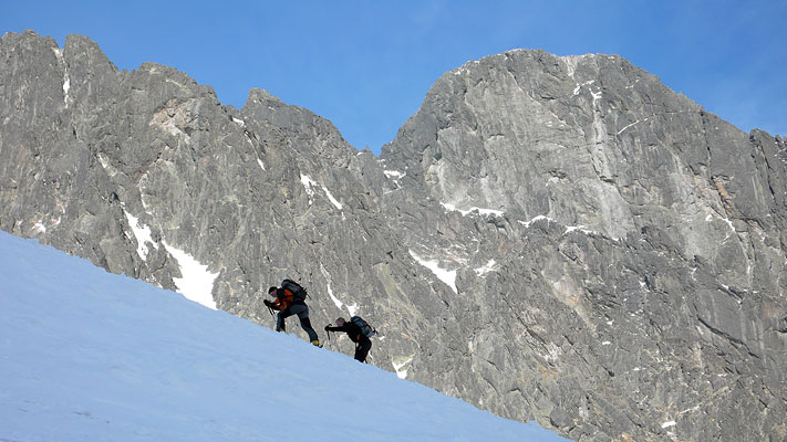 Původně byl v plánu výstup do Baranieho sedla a sjezd Velkou Zmrzlou dolinou na Brnčálovou chatu. V sedle jsme se ale rozhodli kvůli velkému množství nafoukaného udusaného sněhu ve žlebu, že vystoupíme na Baranie rohy a do Zmrzlé doliny raději přejíždět nebudeme. Místo toho jsme sjeli zpět k Teryho chatě a dále pod Filmařský žleb. Žlebem stoupáme do Lomnického sedla. Zde se kocháme krásnými výhledy a odměnou je pak parádní sjezd žlebem.