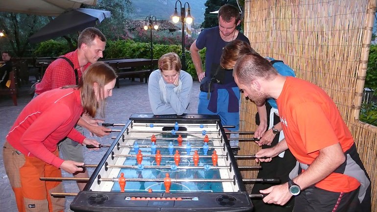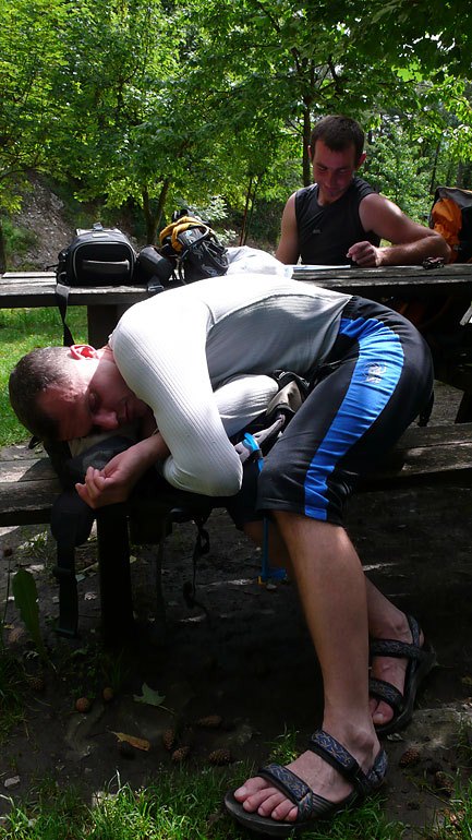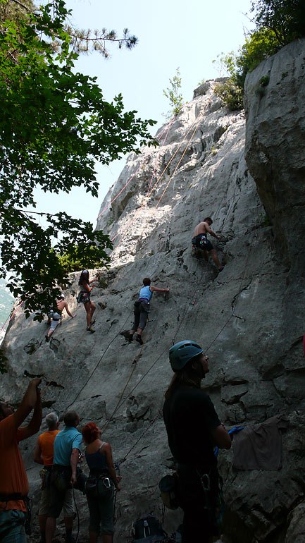 V odpočinkový den jsme trávili v lezeckých obchodech v Arco. Odpoledne jsme se pak zajeli na plotny Corno Di Bò u Lago di Garda, kousek za Torbolou. Tu jsme trošku blbli a kdo vyběhne jak vysoko v sandálech. Nahoru to šlo, horší byla cesta od čtvrtého boráku dolů. V lezačkách jsem pak vyběhl až k prvnímu štandu. Nicméně nedoporučuji opakovat. Krátce jsme se pak i smočili v Gardě. Navečer přišel pravidelný deštík.