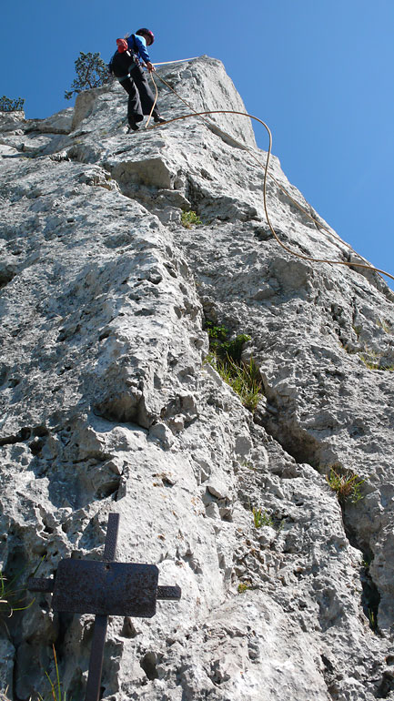 Poslední den jsme byli svědky nehody, naštěstí malé. Dvojice (on a ona) slaňovala stěnou Großer Zinnenkessel, s tím že si nebyla úplně jistá, zda jim 60m lano dosáhne až na zem. Já jsem mezitím dobíral Kláru ve vedlejší cestě Flopo, mj. moc pěkné. Slanění bylo nad převisem, tak nebylo dolů vidět. První tedy slaňoval kluk. Sjel dolů a dal povel dívce, že lano dosáhne až na zem. Mile mi informaci předala a rozloučili jsme se, již končili, čekala je dlouhá cesta do Prahy po D1. Po chvilce slyším žuchnutí, dolů přes převis nevidím, tak jen tuším. Klárka dolézá a potvrzuje mé obavy. Děvče prý projely konce lana rukama a skutálela se do křoví.