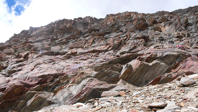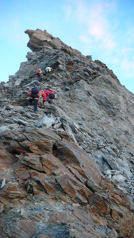 Hned na úvod je potřeba zapojit i ruce, dnes to nebude žádné pochodování po ledovci, ale psychicky náročné lezení. Každý chyt a stup je potřeba před zatížením prověřit. V podstatě je celý JV hřeben (650 m převýšení, ~5 hodin) hromada volně ložených a různě zaklíněných šutrů všech velikostí. Při návratu jsou již některá místa sluncem rozměklá a tak to co ráno alespoň trošku drželo pohromadě mrazem, tak je teď hromada kamení v blátě. Už chápu proč se na Taschorn moc nechodí.
