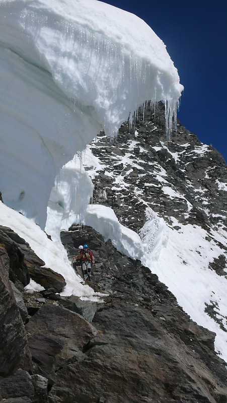 Sněhových převějí se na hřebeni také musí překonat nepočítaně. Na druhé již nasazujeme trvale mačky a také vytahujeme z batohu lano a průběžně se raději jistíme. Celá cesta je celkem slušně exponovaná. Většinou se jde přímo po hřebeni nebo těsně pod hřebenem ve východní stěně. Na několika místech je potřeba cestu hledat, ale nikdy se nejedná o velké zdržení. V celé cestě si pamatuji jen na jednu pěknou stěnku v pevné skále o výšce tak 5m. Jinak je objektivní nebezpečí na této cestě docela velké, volné kameny a převěje.