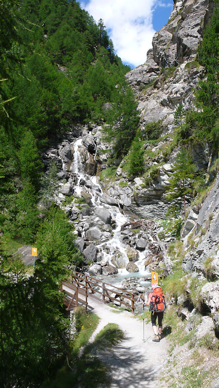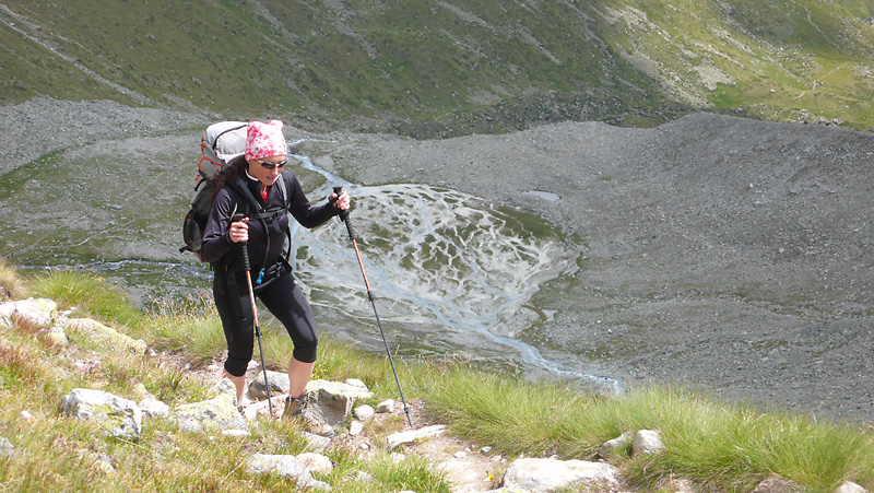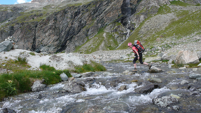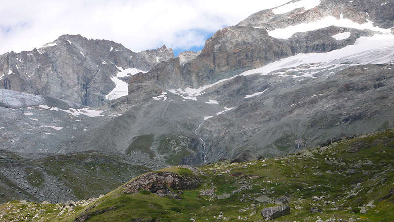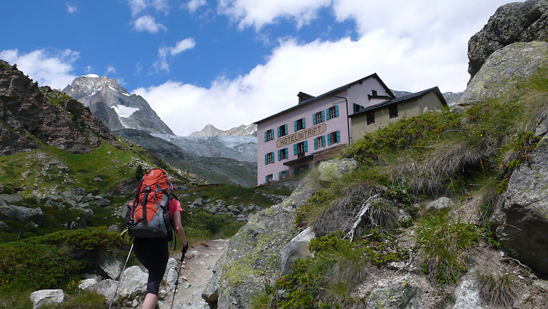 U chaty Berggasthaus Trift dáváme svačinku. Potkáváme tam dvojici s vůdcem z bivaku Mischabeljoch, která právě sestupuje z chaty Rothornhutte, byli i na vrcholu Zinalrothorn. Zatím co mi jsme si dali den volna, oni jeli tři 4-tisícové vrcholy bez přestávky. Jiná liga, a to jim bylo podstatně více roku než nám.