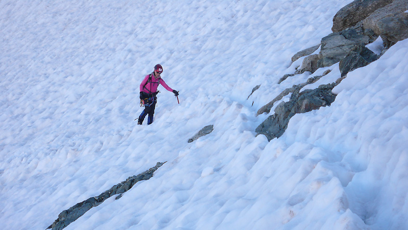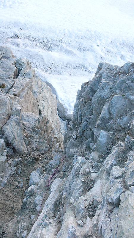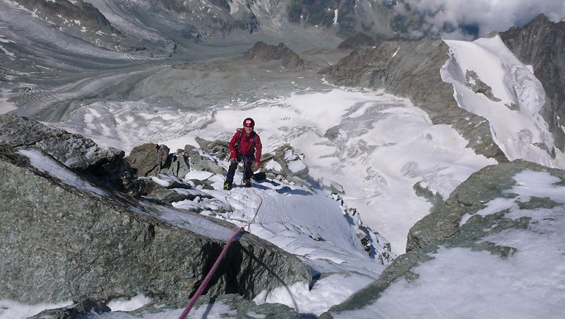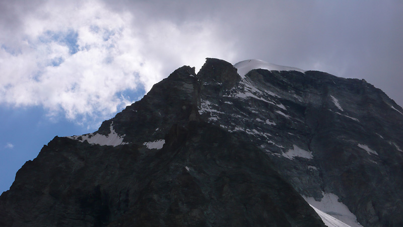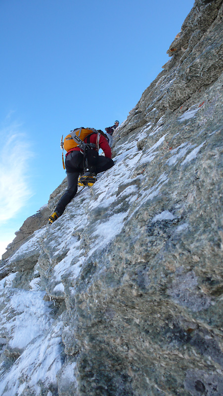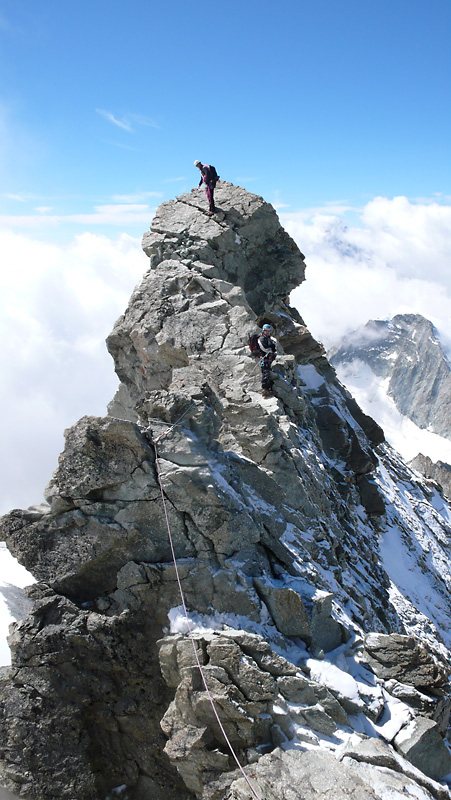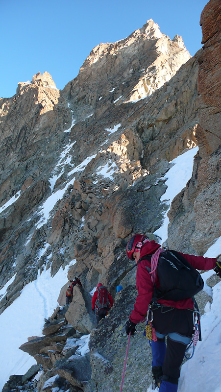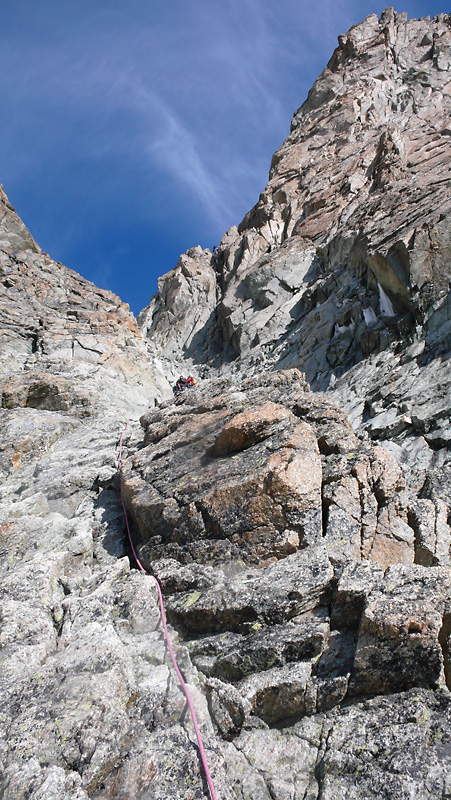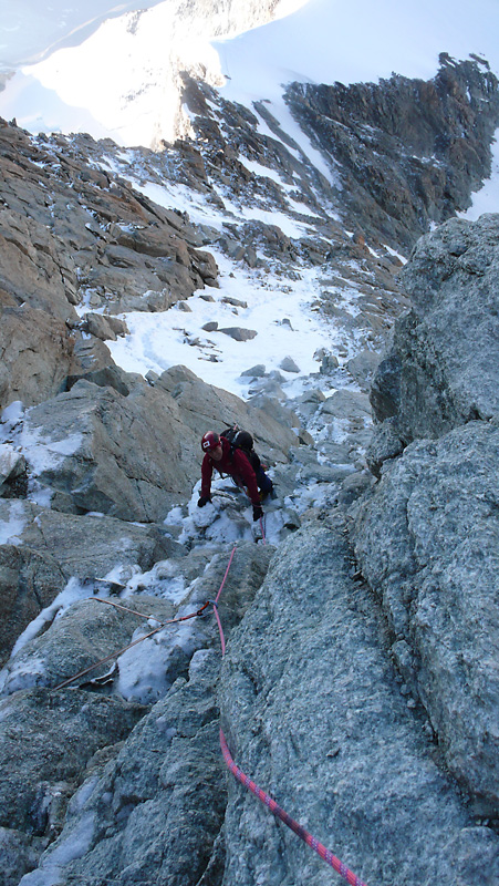 Cesta není úplně orientačně jednoduchá. Přechází se před sněhová pole a kamenné srázy a mužíky moc vidět není. Konečně vidíme vrchol. Zdá se docela blízko, ale víme, že to je klam. Na rozdíl od Taschornu je zde ale krásná pevná žula, takže je lezení o poznání příjemnější. Tím, že jsme na konci, musíme na stanovištích čekat a předbíhat nechceme. Nakonec nic nás netlačí, počasí by mělo být dobré a dvojka před námi je od večeře známa PL-FR dvojka. Na vrcholu jsme tedy s nimi společně. Domlouváme se i na společném slaňování na sestupu. Máme dohromady 2x30 metrů, tak to snad bude lepší.