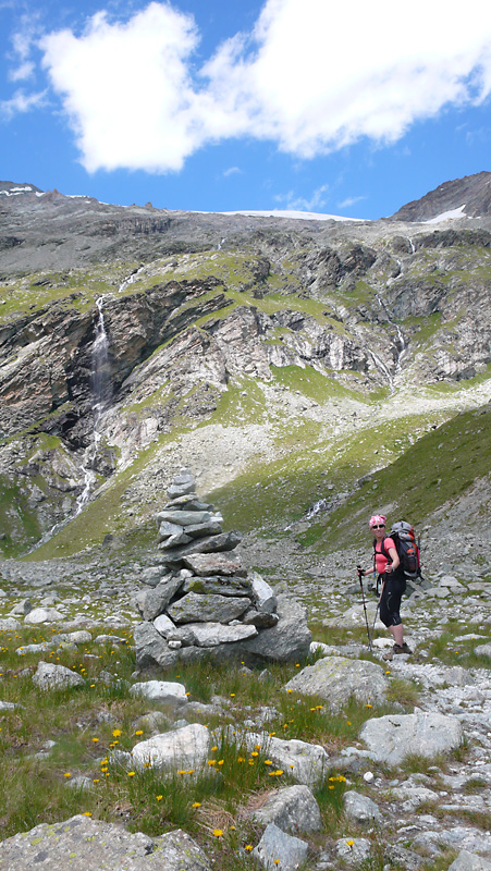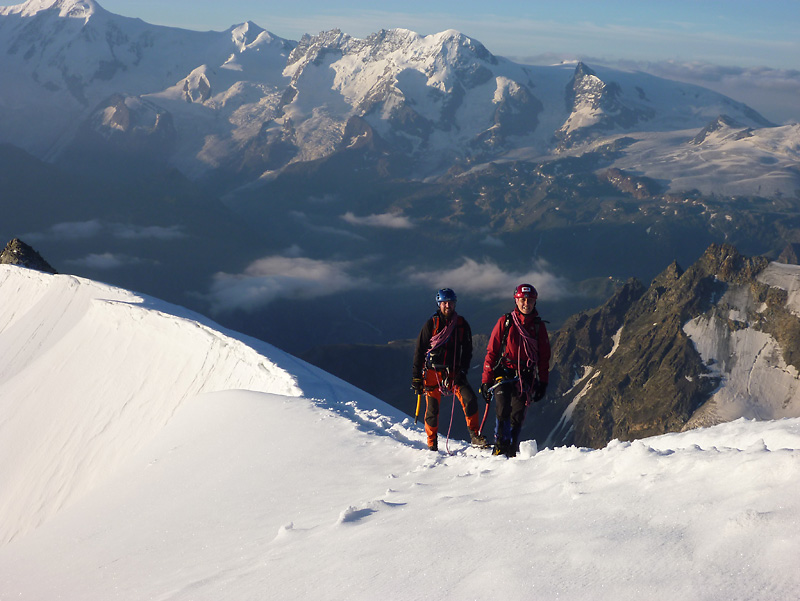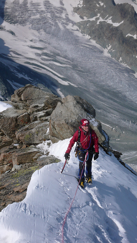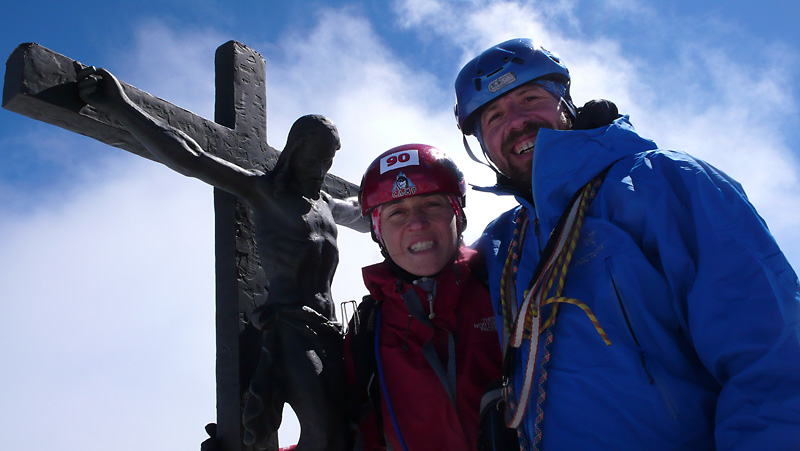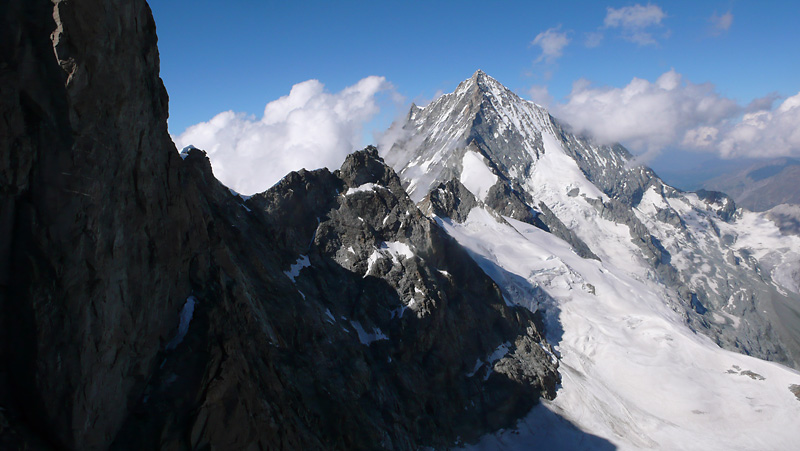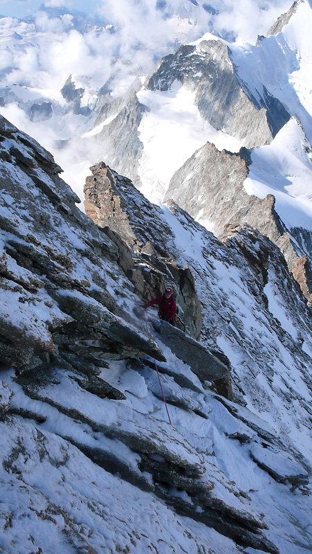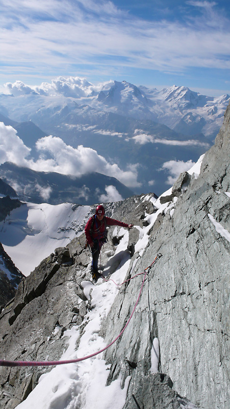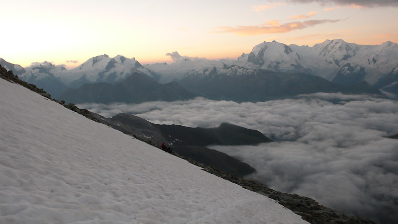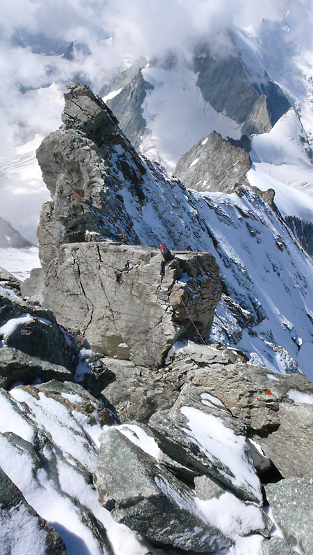 Cesta není úplně orientačně jednoduchá. Přechází se před sněhová pole a kamenné srázy a mužíky moc vidět není. Konečně vidíme vrchol. Zdá se docela blízko, ale víme, že to je klam. Na rozdíl od Taschornu je zde ale krásná pevná žula, takže je lezení o poznání příjemnější. Tím, že jsme na konci, musíme na stanovištích čekat a předbíhat nechceme. Nakonec nic nás netlačí, počasí by mělo být dobré a dvojka před námi je od večeře známa PL-FR dvojka. Na vrcholu jsme tedy s nimi společně. Domlouváme se i na společném slaňování na sestupu. Máme dohromady 2x30 metrů, tak to snad bude lepší.
