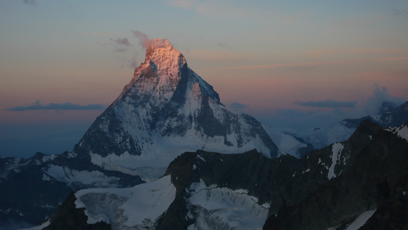 Po letech zase v Zermattu. Naposled to bylo v roce 2OO3, kdy jsme úspěšně došli na skialpech Houte route z Chamonix do Zermattu. Stejné jako před léty, spousta turistů, krásných obchodů, květiny na balkónech, elektrotaxiky a samozřejmě nádhernýa majestátný Matterhorn.