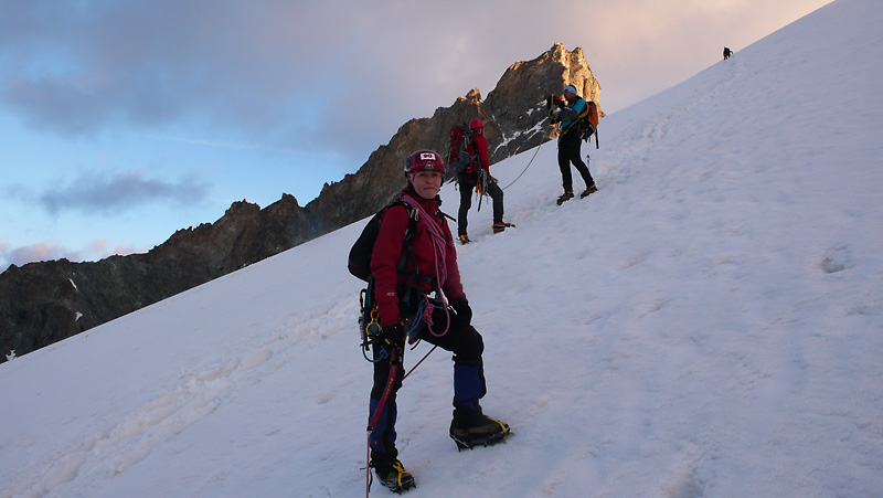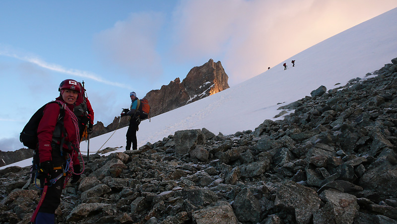 Snídáme o půl čtvrté a po čtvrté jsme již na cestě. Kousek za chatou na ledovci nasazujeme mačky a po nedlouhé cestě docházíme k místu, kde se musí žlábkem prostoupit skalní stěna. Je tu trošku rušno, protože zde jeden vůdce spadl. Hlavu má celou od krve a má něco i s nohou. Zkouší se vrátit s klientem po svých na chatu. Ale po pár metrech zjišťuje, že to nepůjde, a volá vrtulník.