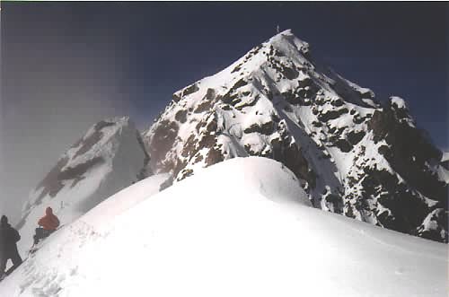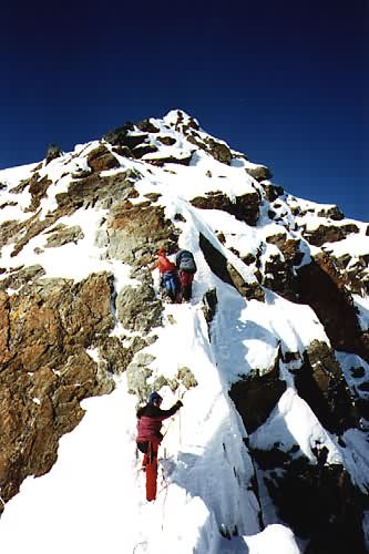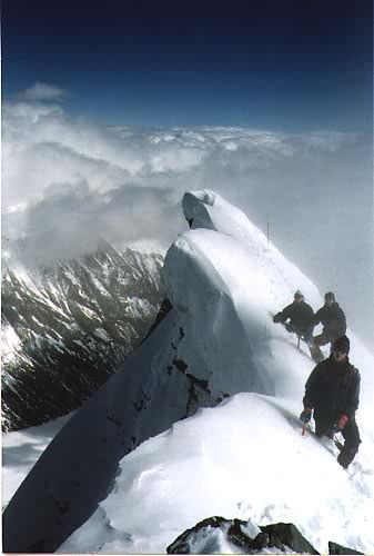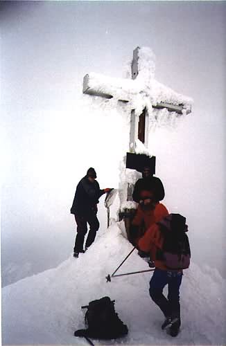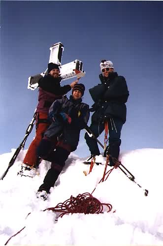 -28. září 1996 - Počasí se umoudřilo a tak před polednem vyrážíme na vrchol. Jdeme "normální cestou" (výstup od východu) 344 m převýšení, částečně pevné zajišťovací body, II, třicetistupňový sklon výstupu "Glocknerleitl", 1.5 hodiny (nejlehčí sestup). Od Adlersruhe přes firnový hřeben a příkrý ledovcový svah "Glochnerleitl" (35 stupňů) na začátek skály, s možností jištění po kovových stupních na Kleinglockner, podél ocelového lana dolů do horní rozsedliny Glockneru (Obere Glocknerschare), přejít podél rozsedlinu po úzkém sněhovém hřebeni, zpočátku po příkrých plotnách (II), později snadno vystupovat ke kříží na vrcholku (3798). Před setměním dorážíme k autu. Již za tmy se přesouváme k GrossVenedikeru.