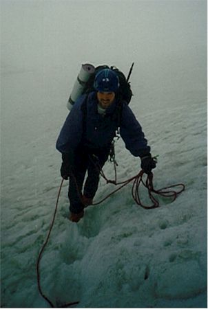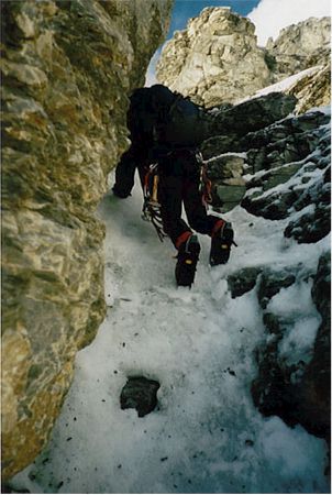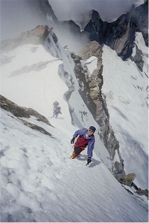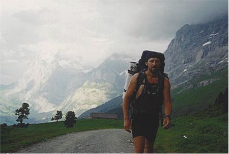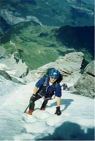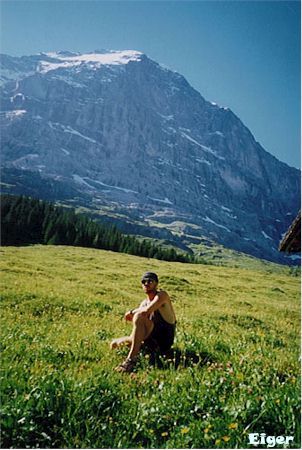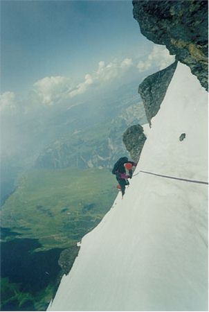 -9. 8. 1997 - V 5 vstáváme a před 7 se nám podaří vyrazit. Dva Španělé mají před námi asi 2 hodiny náskok. Po cestě je asi 25m komín který musíme jistit (lezení II-III). Cestu ve skále díky popisu v průvodci a občas nějakému mužíku zvládáme bez bloudění. Výše ve sněhu nám zase cestu ukazují stopy Španělů. Po cestě je jeden nepříjemný traverz ve sněhu, který opět jistíme. Na vrcholu Eigeru 3970 m jsem pár minut po dvojici Španělů. Cesta zpět se díky odpolednímu slunci stala značně nebezpečnou. Za patami nám hučí sněhové laviny. Donnymu se dokonce jedna přehnala přes hlavu, kdy se v poslední chvíli schoval za skalní výběžek.