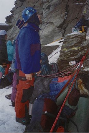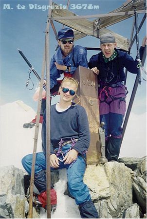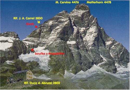 -5. 8. 1997 - Cervinia (2006m) - Rif. Duca d. Abruzi (2802m) - Col de Leone (3580m). Chceme dojít na Rif. J.A.Carrel. Ve 3400m se náhle objeví bouřka s krupobitím. Pěkná mela. Kámen mi proráží díru do přilby. Pěkně jsme promokly a dostaly menší šok. Bouřka a hledání cesty u Lvího sedla nás pořádně zdrželo. Začíná se stmívat a my jsme nalezení v nepříjemném komíně, kudy normálka nevede ani náhodou. To už nám ale svítí na cestu čelovky. Ke všemu ještě musíme svítit na cestu Polákům, kteří jsou super nevybaveni (Jeden je na tom špatně i fyzicky). Přes skalní plotny a výšvihy se dostáváme ke kolmé stěně, na které je v koutě ocelový řetaz. Poláci se rozhodli, že tu přebivakují. My chceme dojít až na chatu. Podle výškoměru by měla být několik desítek metrů nad námi. Jenže někteří z nás už nemají sílu vylézt po řetaze nahoru a tak se připravujeme také k bivaku 3700m. Mezitím doráží ještě skupinka 5 Čechů - Pražáků. 4 hoši a jeden 65-letý horolezec! Ráno nám všem ukázal. Tolik energie na svůj věk. Takže se nás nakonec tlačí na skalní římse 12. Přivázaný zalézám do spacáku a žďáráku. To bude noc.