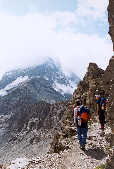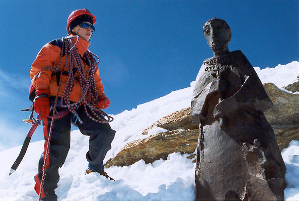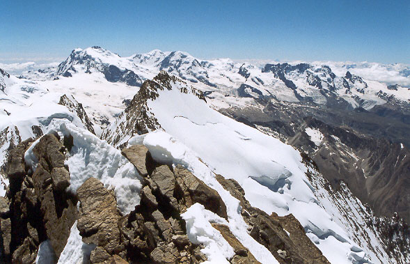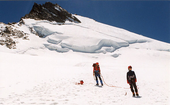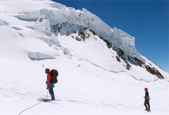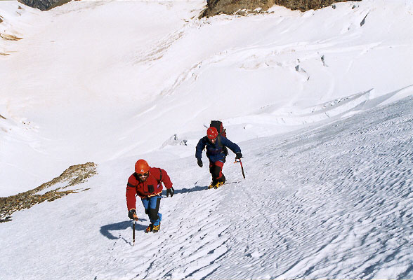 Sestupová cesta vede severními ledovcovými a firnovými svahy. Sestupujeme již dost pozdě a tak máme docela oprávněný strach z nebezpečí pádu ledu, případně i laviny. Po levé straně jsou totiž obrovské ledovcové zlomy a visuté ledovce.
