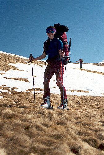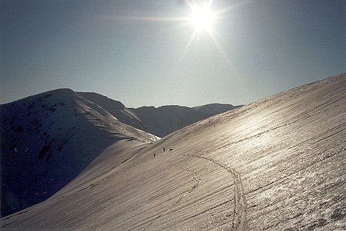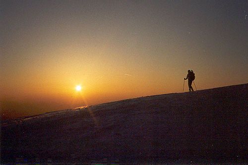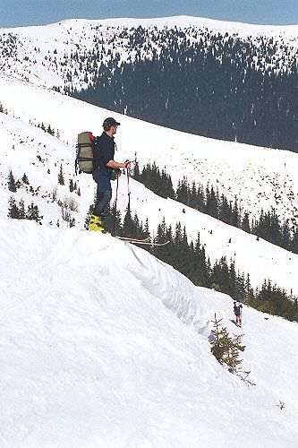 Poprvé sundáváme z lyží pásy a sjíždíme směrem k vrcholu Dereše. Mírně zvlněným terénem jdeme bez pásů (Davidovi to šlape jako by pásy měl), až pod vrchol Kotliské (původně jsem myslel, že je to již Chabanec). Zde následuje opět krátký sjezd a dnes již závěrečný výstup na Chabanec (1955m). Pak již následuje poslední sjezd při západu slunce k útulně pod sedlem Ďurková.