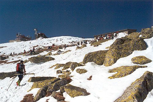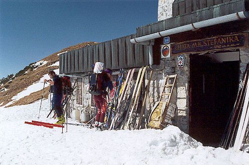První zastávku děláme na chatě M.R. Štefánika, kde dáváme pivko a malou sváču. Zatím bylo na hřebeni celkem liduprázdno. Na Kamennou chatu nejdeme přes vrchol Ďumbieru, ale traverzujeme jeho jižní srazy. Cestou je již několik míst bez sněhu. Na Kamenné chatě dáváme polévku a pivko a trochu větší oraz. Jsme již za půlkou dnešní části.