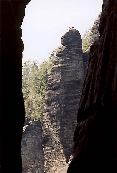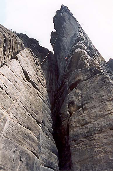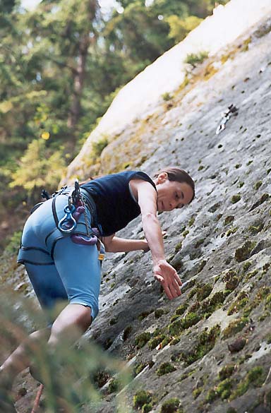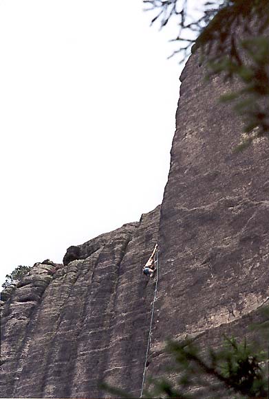 Letos jsme si konečně odbyli naši lezeckou premiéru v Teplických skalách. Začali jsme pozvolna cestou na Harfu - Splín šedých mechů /4/. Poté jsme se dlouho rozhodovali kam vylézt a přitom se nezabít. Nakonec jsem vybral cestu na Kótu 324 /6-/ (2 věz napravo od Feťácké). No a na závěr jsme si troufli na Feťáckou - cesta Marihuana /6+/. Byli jsme moc spokojeni.