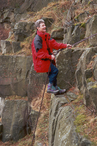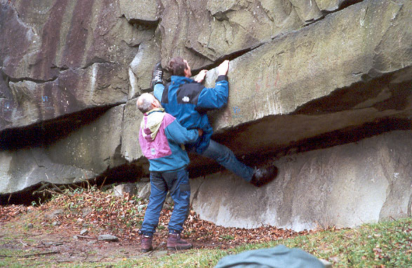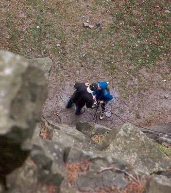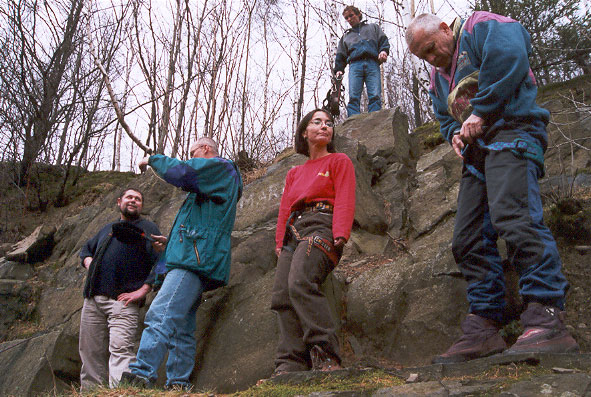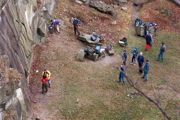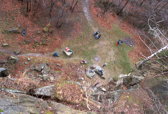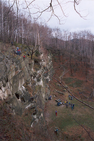 Po zředění krve v restauraci Godula v Komorní Lhotce se přesouváme do starého kamenolomu Godula (dříve se zde těžil nazelenalý godulský pískovec), kde na místních pískovcových skalkách všichni absolvujeme poslední slanění. Někteří jsou do toho odvážně a po vzoru dávných horolezců slaňují Dulferovým způsobem. Aź na malé spáleninky úspěšně.