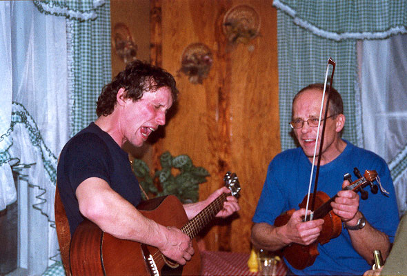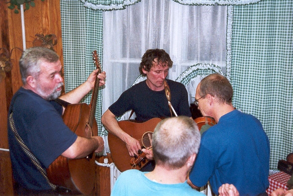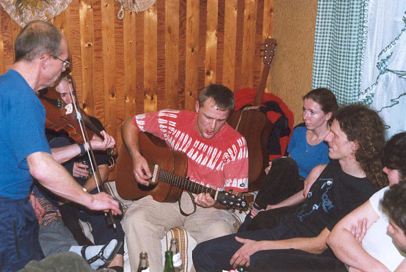 Poté již se přesunujeme na chatu Kotař, kde se vše řádně zapíjí za doprovodu kytar a houslí.