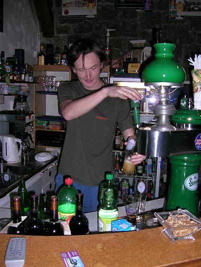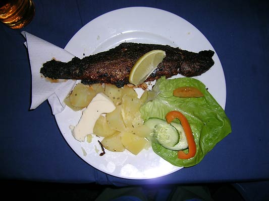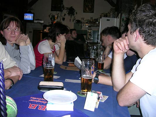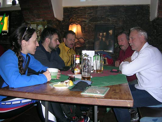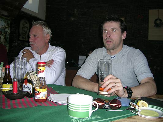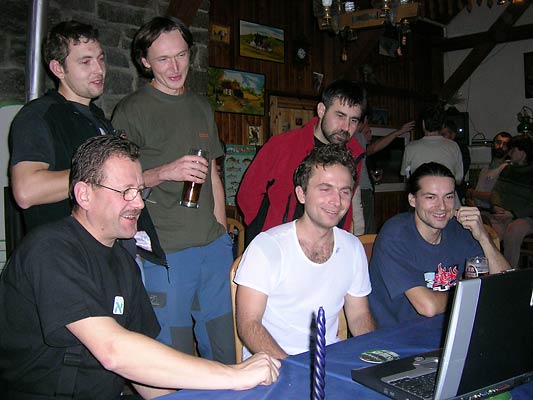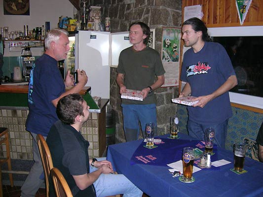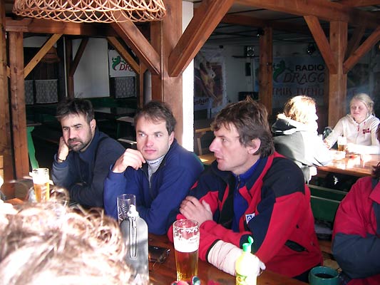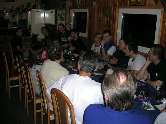Po večeři, kdy jsme si pochutnali na pečeném pstruhu z vlastní produkce chaty, následoval program. Nejdříve Renda předal cenu za nejhodnotnější výkon roku aktérům Marku Holubcovi a Pavlu Pospíšilovi za sjezd (16.4.2004) Pallavicini kuloáru na GrossGlockneru a představil kalendář akcí na rok 2005.